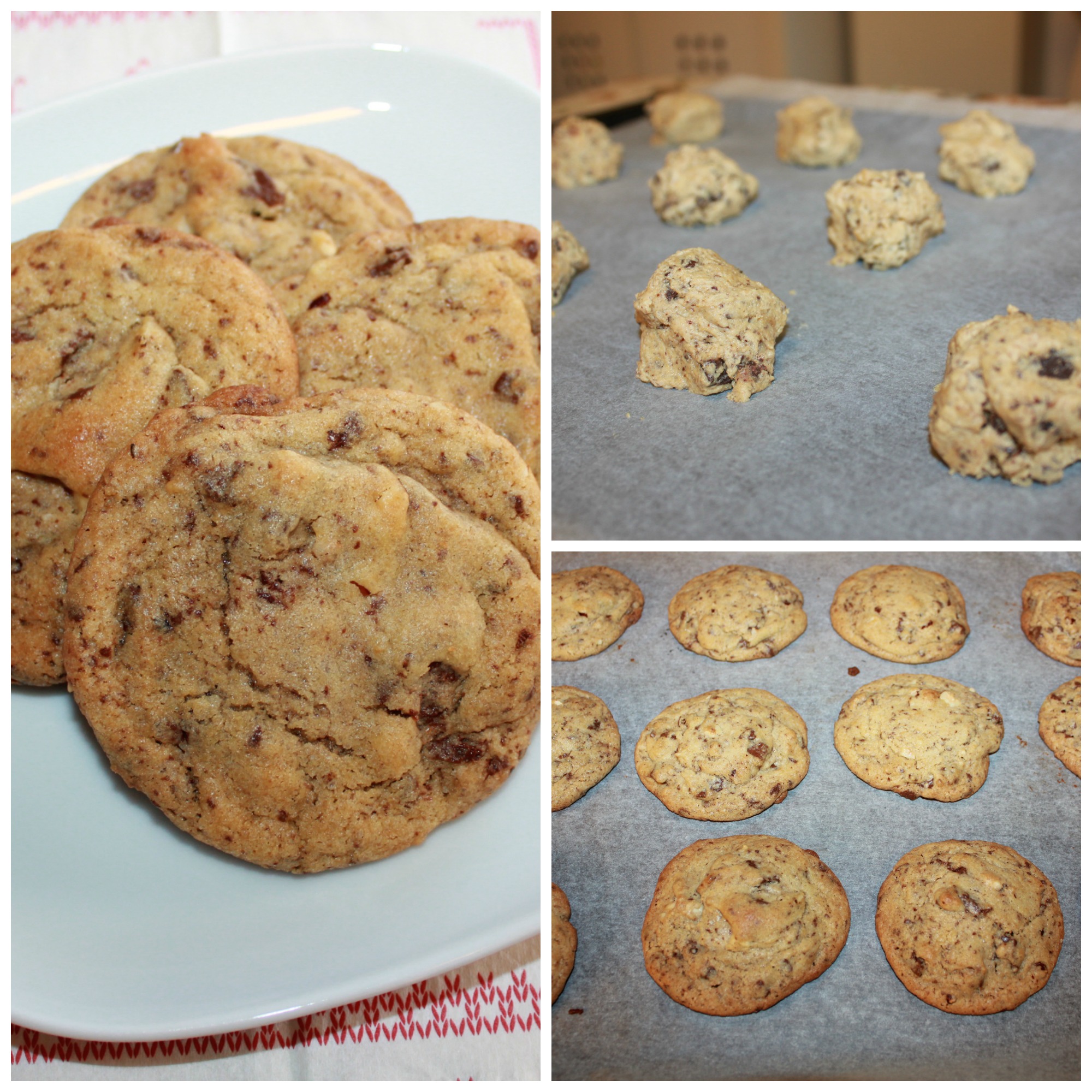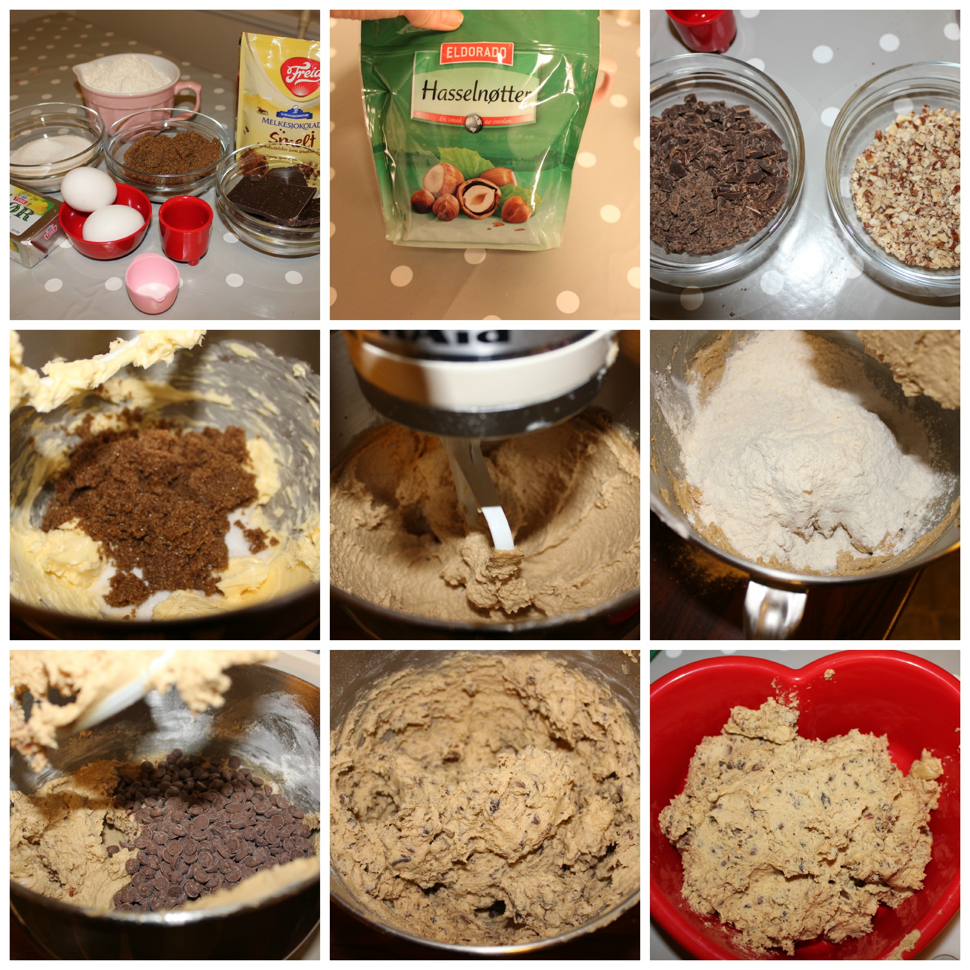 Pisk mykt smør luftig sammen med hvitt og brunt sukker. Tilsett eggene under fortsatt pisking. Rør så inn vaniljeessens og natron. Bland til slutt inn hvetemelet , hakket sjokolade og hasselnøtter .Sett deigen kjølig i ca 30 min.