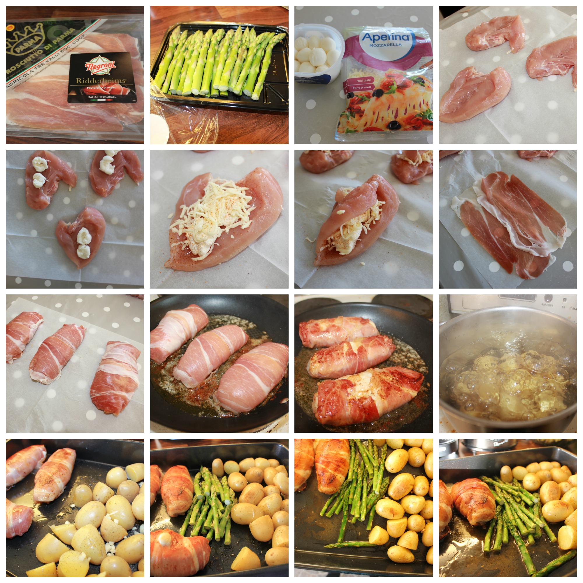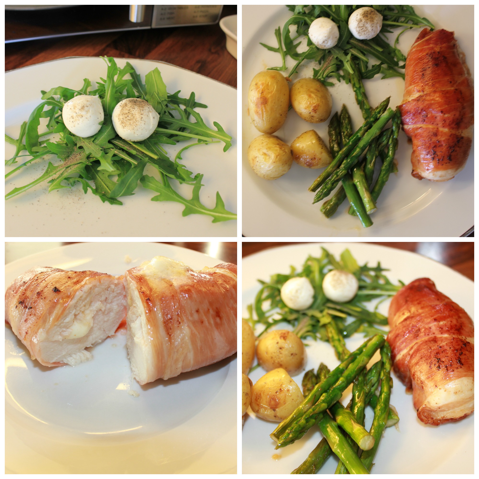 Her får du oppskrift på Ostefylt kylling snurret i Proscutto di parma skinke servert med aspargestopper og Amandine poteter.